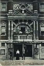 The Grand Theatre stood on the corner of Windsor Terrace and Civic Centre Road. It was constructed in 1898 but included some 18th-century buildings on its east side. It was designed by the architects William Hope and J. C. Maxwell of Newcastle upon Tyne and was built by Messrs Jenkins & Sons of Southampton in red brick with terracotta dressings in a French Renaissance style. The front entrance was enhanced with a balustrade above and a central tower, at the top of which was a high domed lantern fitted with a purple light.[2]