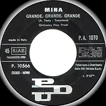 "Grande, grande, grande" was a No. 1 hit on the Italian Singles Chart for Mina in 1972, from her No. 1 self-titled album. The single was released in early 1972 and entered the Top 10 the week of 26 February.[2]