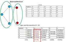 In such a scenario, the second smallest eigenvalue () of , yields a lower bound on the optimal cost () of ratio-cut partition with . The eigenvector () corresponding to , called the Fiedler vector, bisects the graph into only two communities based on the sign of the corresponding vector entry. Division into a larger number of communities can be achieved by repeated bisection or by using multiple eigenvectors corresponding to the smallest eigenvalues.[12] The examples in Figures 1,2 illustrate the spectral bisection approach.