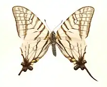 Upperside dead white or very pale cream colour. Forewing: cell partially, and interspaces between the dusky black outer discal markings more or less semitransparent; cell crossed by five black bands, the basal two of which extend to the dorsal margin, the subapical to a little below the modim vein; a black band along the discocellulars, joined at costal margin and above lower apex of cell to the band traversing the cell near its apex; a broad transverse postdiscal black band from near tornal angle to costa; this band double above vein 5, forms three well-marked loops; subterminal and terminal narrower transverse black bands, the former joined onto the postdiscal band near tornal angle; lastly, the postdiscal band outwardly and the terminal band inwardly, broadly and diffusely bordered with dusky black. Hindwing: a narrow black line from base along the dorsum, a broader black line along vein 1, joined below the cell by a broad black band that crosses the latter subbasally, a black patch on the produced posterior portion of the wing, studded at the tornal angle with two conspicuous yellow spots, below which there is a triangular white dorsal mark; the black patch with three somewhat obscure blue subterminal lunules; the tail narrowly edged with white; a narrow black medial line from costa that crosses near apex of cell and terminates on the median nervure; at the upper and lower ends of this are loops formed of slender black lines, in the female well marked, in the male seen only by transparency from the underside; finally, discal, postdiscal and subterminal slender black transverse lines from the costa terminate in the black anal patch. Underside similar, with similar but much more heavily defined black markings, the upper or costal loop on the short medial transverse black line tinged with yellow; the whole of the median vein and the discocellulars broadly defined in black. Antennae black; head, thorax and abdomen black, with some white pubescence, the head anteriorly tufted with black; head, thorax and abdomen beneath whitish yellow.[1]