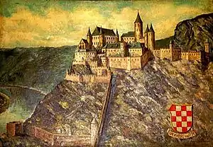 In 1680 it was conquered by Louis XIV of France and was extended, together with the fort of Mont Royal in the horshoe bend of the Mosel north of the town of Traben-Trarbach as a part of the fortifications. During the War of the Spanish Succession (1701–1714), in 1702 it was taken by the French under Tallard and in 1704 on the express orders of the commanding officer John Churchill, 1st Duke of Marlborough it was overpowered by Friedrich of Hesse-Kassel. The badly damaged castle was then occupied by the Dutch. In 1730 it was repaired by the Electorate of Trier for the defence of Koblenz and the Rhine river. In the War of the Polish Succession it was taken after three weeks' siege for the fourth and last time by the French who destroyed it in July 1734.[1] The castle was blown up, huge chunks of it have plunged into the valley beneath.