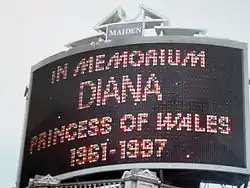 A worldwide exhibit of mourning sickness, centred on Britain once again, following the death of Diana, Princess of Wales in 1997 when the Princess was killed in a car crash in Paris. Almost immediately following word of her death, makeshift memorials to Diana, who had been a hugely popular figure worldwide since her marriage to Prince Charles in 1981, began to pop up, most notably at her residence at Kensington Palace. The memorials became a gathering place for public weeping and for people to bring flowers.[3] Ian Jack, writing in The Guardian, argued that this recreational grieving changed a simple observer of a news story into an active participant, changing people "from audience to actor".[3]
