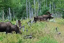 The most notable animal in the park is the moose, part of a booming population that was introduced to Newfoundland around 1900. Other common wildlife in the park include red foxes and Arctic foxes, an ecotype of caribou (R.t caribou), black bears, snowshoe hares, red squirrels, lynxes, river otters and beavers. Harbour seals are common in St. Pauls inlet, and cetaceans (minkes, humpbacks, fins, pilots, orcas, atlantic white-sided dolphins, harbour porpoises)[9] may be in the area especially during the capelin season in early summer. Many bird species can be found in the park, from shorebirds along the ocean to birds of the bogs and interior forests.[10]