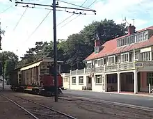 Directly opposite the station is the now closed Groudle Glen Hotel which was built upon the arrival of the railway in 1893 and designed by the renowned architect Baillie Scott. It operated as a public bar for many years before being sold by the local brewery in 1999 and converted into a restaurant known as "La Casa". Its remote location ensured that the venture was not entirely successful; however, the new owners did much aesthetic work on the building, restoring stained glass windows, recreating historical signage and completely repainting the building including much of the original detailing such as the "three legs" motifs in the cornice work.