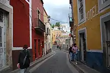 Guanajuato (Spanish pronunciation: [gwanaˈxwato]) is a municipality in central Mexico and the capital of the state of the same name. It is part of the macroregion of the Bajío.[2] It is located in a narrow valley, which makes its streets narrow and winding. Most are alleys that cars cannot pass through, and some are long sets of stairs up the mountainsides. Many of the city's thoroughfares are partially or fully underground. The historic center has numerous small plazas and colonial-era mansions, churches, and civil constructions built using pink or green sandstone. The city historic center and the adjacent mines were proclaimed a World Heritage Site by UNESCO in 1988.