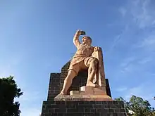 The War of Independence broke out in the state of Guanajuato in the town of Dolores, when Father Miguel Hidalgo y Costilla shouted the “Grito de Dolores” and raised an insurgent army on September 15 and 16, 1810. This army marched to San Miguel, today San Miguel de Allende, and then on to the city of Guanajuato. Just on the outskirts on September 28, 1810, Hidalgo sent a warning letter to city authorities, but it was ignored.[4] Instead, royalist troops and many of the elite made their stand at the Alhóndiga de Granaditas granary, an imposing building with few windows and thick walls. After entering the city unopposed, Hidalgo decided to attack the granary. This was the first battle against Spanish troops in the war and is popularly called the 'Siege of the Alhondiga'.[4][5] The insurgents were unable to take the heavily defended building as royalist gunfire kept them from approaching the only entrance until a miner by the name of Juan José de los Reyes Martínez, better known as El Pípila, strapped a large flat stone onto his back for protection. Crawling, he carried a flask of tar and a torch. When he reached the wooden doors of the main entrance, he smeared it with the tar and set it on fire. This allowed the insurgents to penetrate the building, defeat the Spanish royalist army and elite, and take over the heavily fortified and defended building. This action is commemorated by a colossal statue of El Pípila on a hill overlooking the city.[16]