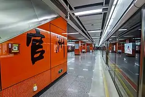 Guanzhou Station (Chinese: 官洲站; Cantonese Yale: Gūnjāu Jaahm) is a station of Line 4 of the Guangzhou Metro. It started operations on 26 December 2005. It is located at the underground of the central part of Guanzhou Island in Haizhu District.[1] It was constructed to cope with the Guangzhou International Biological Island,[2] a science and technology development zone led by biological industry that opened in 2011.[3][4]