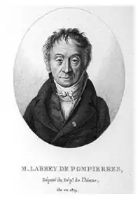 As a constitutional monarchist, Labbey de Pompières remained in retirement for a few years after the second Bourbon Restoration. He was elected to represent the Aisne on 11 September 1819.[2] He sat on the left with the liberal opposition, and despite his age played a very active part in the debates. It was said that he was almost twice the age of eligibility for a deputy, and made as much noise as four or five.[4] He voted against the emergency laws, the new electoral system and violations of the Charter of 1814. On 6 March 1820 he proposed a reform of the electoral system to reduce the opportunities for fraud, but this was rejected. He spoke against the censorship law and proposed many amendments to the budget to reduce expenditures.[2] In the 1822 session he again attacked the press laws. He opposed the war in Spain.[3]