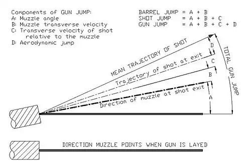 When a gun is fired, the angle of the muzzle changes, and there is a transverse velocity component of the muzzle. If the shot followed the center-line of the bore exactly, then the difference in initial trajectory of the shot compared to the initial pointing angle of the muzzle would be equal to the change of muzzle angle plus its transverse velocity component divided by the shot velocity relative to the muzzle at exit. This may be referred to as barrel jump. In the case of a perfectly fitting non-spinning solid ball, this would compose all of the gun jump.
