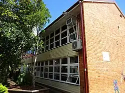 Block C, which extended northeast from, and perpendicular to, the northwest end of Block B, was also a timber school building with timber floor trusses (1956–57) and was used for Intermediate students on the first floor, and High School students on the ground floor. It had a drawing room at the southwest end of the first floor; then a library and reading room; and an Intermediate staff room, with an enclosed corridor along the northwest side of the building. The ground floor included, from the southwest end: a science lecture room; a physics lab; two store rooms; and a chemistry lab. Blocks B and C were connected by a concrete and brick stairwell to both levels, and also had brick end walls as fire stops (northwest end of Block B; both ends of Block C).[74][77] The drawing room and library were initially used as three temporary classrooms. By 1982 the chemistry lab and storeroom had been condemned and were being used for storage, with the rest of the floor used for art and a normal classroom.[78] The high quality of the buildings was recognised at the time and Blocks B and C were chosen as examples of notable High School architecture in "Buildings of Queensland", a 1959 publication recording Queensland's architecture produced by the state chapter of the Royal Australian Institute of Architects.[79][1]