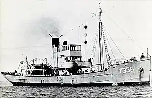 Maimai was the third of the nine minesweepers constructed for the Royal New Zealand Navy and was commissioned on 28 July 1943. the others being Aroha, Awatere, Hautapu, Pahau, Waiho, Waima, Waipu, and Waikato (never commissioned). She served with the 95th Auxiliary Minesweeping Group, located at Wellington.[2] In March 1944, Maimai would accidentally fire her port depth charge thrower while berthed at Picton.[3] The unexploded depth charge was recovered four weeks later.[3] On 27 July 1945, she was rammed by Awatere stern-to-stern at Shelly Bay, with minor damage.[3] After the war, Maimai was disarmed but remained in service for ammunition dumping.[3] In 1946, Maimai was purchased by the Maimai Trawling Company Ltd. to be used as a side trawler.[3][2]