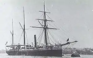 She commenced service on the Australia Station in January 1888,[1] serving in New Zealand waters. Commander John Campbell Watson was appointed in command in July 1899, and served until late 1902. In 1900 she was detached to serve on the China Station during the Boxer Rebellion, and she stayed in Chinese waters until August 1901,[2] when she returned to the Australia station. She was the first warship to enter Kiama, New South Wales. Her crew was paid off in September 1902 and ordered back home on a steamship.[3] She was laid up at Sydney in 1904.[1]