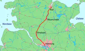 The Hamburg-Altona–Kiel railway (historic name: The King Christian VIII Baltic Railway[lower-alpha 1]) is one of the most important main line railways of the states of Schleswig-Holstein and Hamburg in Northern Germany. The line runs through the region of Holstein and connects the cities of Hamburg, Elmshorn, Neumünster and Kiel.[2] The 105 km (65 mi) long standard gauge double track electrified railway line is now owned by DB Netz.
