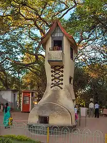 The Hanging Gardens, in Mumbai, also known as Pherozeshah Mehta Gardens, are terraced gardens perched at the top of Malabar Hill, on its western side, just opposite the Kamala Nehru Park. They provide sunset views over the Arabian Sea and feature numerous hedges carved into the shapes of animals. The park was designed and laid out in 1881 by Ulhas Ghapokar over Bombay's main reservoir, some say to cover the water from the potentially contaminating activity of the nearby Towers of Silence. When seen from the air, the walkway inside the park (Hanging Gardens Path), spell out the letters PMG (Pherozeshah Mehta Gardens) in cursive.