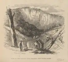 During 1853, American gold miners dug, an approximately 23 km, water race from Callaghans Swamp to underneath the Hanging Rock cliff face. Also that year Californians dug another water race from the swamp at the head of Dangars Gully to Nuggety Gully. In 1882, it took about twelve months to cut a 13 km water race from the Barnard River on the eastern side of the rough mountainous Great Dividing Range to the western side of the Range. Just south of Hanging Rock village are the Sheba Dams (with a surface area of 3.6 ha) which were erected by hand over a three-week period in 1888 to serve the sluicing needs of the miners. This construction was carried out by the Mt Sheba Company which leased the water rights for the area. Other water races were also constructed to feed various other mines around Bowling Alley Point and Hanging Rock.[2]