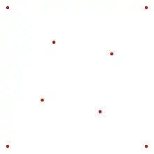 - f(5) = 9.[4] A set of eight points with no convex pentagon is shown in the illustration, demonstrating that f(5) > 8; the more difficult part of the proof is to show that every set of nine points in general position contains the vertices of a convex pentagon.