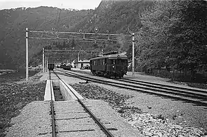 In the first year of operation, the line had 60,850 passengers, significantly over expectations.[17] After the opening, there were five daily round trips. In 1939, the extension of the longest tunnel started, because the nearby section was subject to landslides. It was completed by the German occupational forces during World War II, but not taken into use by the railway until 1945 because of the German military's use of the tunnel as an ammunition depot. Because of the electric traction, the line was not affected by the lack of coal during World War II, and in 1945 it had 285,900 passengers. After the end of the war, the number of daily round trips increased to seven, but this was reduced to six in the 1950s.[5] In 1955, a morning and evening coach service started between Granvin and Voss. It was further extended in 1968, when it started corresponding with services on the Bergen Line.[18]