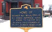 Charles de Berard Mills and Harriet Ann Mills were abolitionists.[2] Harriet May Mills, their daughter, was active in women's rights. She co-founded a suffragette club, the Political Equality Club, in 1892, which grew rapidly.[2] She was the first female to run for a major statewide office as a candidate of a major political party, running for New York State's Secretary of State in 1920.[2]