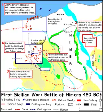 The magnitude of the armament sent under Hamilcar, who is said to have landed in Sicily with an army of 300,000 men, sufficiently proves that the conquest of Himera was the pretext, rather than the object, of the war. However, it is likely that the growing power of Himeria in the immediate vicinity of the Carthaginian settlements of Panormus and Solus had already caused concern among the Carthaginians. Hence it was against Himera that the first efforts of Hamilcar were directed. Theron, who had thrown himself into the city with all the forces at his command, was able to maintain its defence until the arrival of Gelon of Syracuse. Despite the numerical inferiority of his forces, he defeated the army of the Carthaginians with such slaughter that the Battle of Himera in 480 BC was regarded by the Greeks of Sicily as worthy of comparison with the contemporary victory of Salamis.[6] The same feeling probably gave rise to the tradition or belief, that both triumphs were achieved on the very same day.[7]