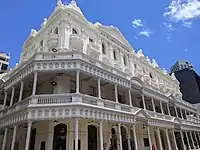 The exterior of the theatre was originally lined with two-level verandah balconies, which provided relief to the imposing walls.[2] These were removed in 1947-48, because authorities considered that the proximity of the supporting pillars to the road constituted a traffic hazard.[17] As a result, there is a disparity between the ornamentation at the top of the building's facade and the lower three storeys, which were previously obscured by the balconies.[2]