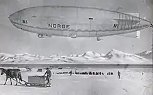 Svalbard was used as the starting point for several expeditions to reach the North Pole by air. S. A. Andrée's Arctic Balloon Expedition failed in 1897.[34] Ny-Ålesund was the basis for four attempts between 1925 and 1928, including Roald Amundsen's first attempt with a flying boat; Floyd Bennett and Richard E. Byrd claimed they succeeded in 1926, but this has since been rejected.[35] Amundsen's airship Norge is now credited as the first to the pole. Umberto Nobile's airship Italia crashed in 1928, resulting in the largest search in polar history.[35]