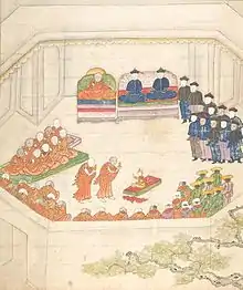The 5th Dalai Lama initiated the construction of the Potala Palace in Lhasa in 1645.[66] During the rule of the Great Fifth, two Jesuit missionaries, the German Johannes Gruber and Belgian Albert Dorville, stayed in Lhasa for two months, October and November, 1661 on their way from Peking to Portuguese Goa, in India.[67] In 1652, the 5th Dalai Lama visited the Shunzhi Emperor of the Qing dynasty. He was not required to kowtow like other visitors, but still had to kneel before the Emperor; and he was later sent an official seal.[68]