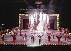 A traditional element in each Holiday on Ice show is the precision number with its famous spinning wheel, in which the skaters link arms with each other, one by one, lengthening the two spokes which spin around a center point. For many years, the traditional kickline, the light finale with illuminated costumes and fireworks fountains, ended shows.