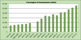 By the turn of the 21st century, passenger numbers at Honeybourne were slowly increasing: from an estimated 13,360 in 1997–98 to an estimated 22,077 in 2004–05. Since then the number of passengers using the station has increased rapidly, and the estimated total for 2018–19 was more than 66,000.[47] Estimated passenger totals have risen by 78% in 10 years and trebled in 14 years.