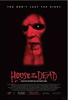House of the Dead is a 2003 action horror film directed by Uwe Boll, from a screenplay by Dave Parker and Mark Altman. Based on The House of the Dead video game franchise by Sega Corporation and Wow Entertainment, Inc., it is not a direct adaptation of the individual entries; Boll described the film as a prequel to the original 1996 game. It stars Jonathan Cherry, Tyron Leitso, Clint Howard, Ona Grauer, Ellie Cornell, and Jürgen Prochnow. The film takes place on a fictional island infested by zombies, forcing survivors to fight their way off. House of the Dead was Boll's first film to be released theatrically, in addition to his first video game adaptation.
