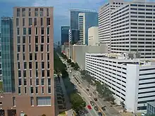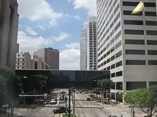 Main Street within the Texas Medical Center, viewed from the Baylor College of Medicine (view towards Downtown Houston). On the left is BioScience Research Collaborative.