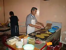 Huarache (sometimes spelled guarache; [waˈɾatʃe] ) is a popular Mexican dish consisting of masa dough with smashed pinto beans placed in the center before it is given an oblong shape, fried, topped with green or red salsa, onions, potato, cilantro and any manner of protein such as ground beef or tongue, then finished with queso fresco.[1] Huaraches are also often paired with fried cactus leaves, or nopales. This dish is most popular in its hometown of Mexico City and is also sold in cities with large Mexican-American populations such as Los Angeles, Albuquerque, San Diego, Salt Lake City, Phoenix, Chicago, Denver, San Francisco, Omaha, San Antonio, Dallas/Fort Worth, and Houston, but have yet to become widely available across the entire United States.[2] Still, huaraches and other Mexican dishes have increased their presence in the Midwest due to increasing numbers of Latinos in rural America.