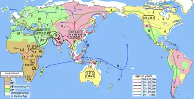 | Haplogroup | Est. time of origin (kya)[6] | Possible place of origin | Highest frequencies |