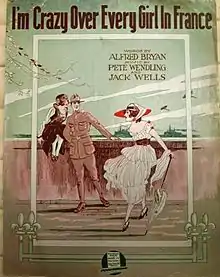 "I'm Crazy Over Every Girl In France" is a World War I song written by Alfred Bryan and composed by Pete Wendling and Jack Wells. The song was published in 1917 by Waterson, Berlin, & Snyder Co., in New York, NY. The sheet music cover, illustrated by Barbelle, depicts a soldier standing against a sea wall with a woman on top of the wall, her arm on his shoulder watching another girl walking by and features battleships in the background.[1]