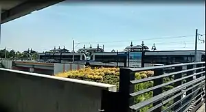 Originally, the southern terminus for the Blue Line was proposed for downtown Pineville, near NC 51.[3] In 2002, the southern end was moved approximately 1.5 miles (2.4 km) to the north along South Boulevard at its present location as a result of low projected ridership figures for the proposed downtown Pineville station.[3] The parking garage was the only one constructed along the original line, and was built in a ravine adjacent to Sterling Elementary School. The 1,120 space garage and overflow lot was completed at a cost of $22.9 million, with the top floor featuring a playing field for the adjacent school.[2][4] The station officially opened for service on Saturday, November 24, 2007, and as part of its opening celebration fares were not collected.[5] Regular service with fare collection commenced on Monday, November 26, 2007.[5] In late 2008 the station received the Federal Highway Administration's Award of Excellence in the "Intermodal Transportation Facilities" category.[6] In November 2008, an additional 54 space parking lot was opened to the east of the station platform due to frequent overflow conditions (later expanding to 246 spaces).[7] By August 2009, digital signs were added to the garage to alert motorists as to how many spaces remain prior to entering the facility.[8] In 2015, the island platform was extended to allow three-car trains at the station.[9][10]