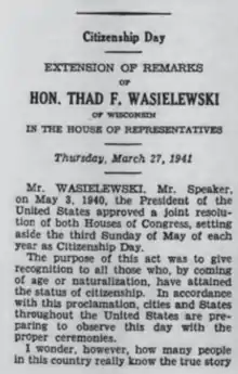 13. Congressional Record, H1941, Appendix to the Congressional Record, p. A1473, Extension of Remarks of Hon. Thad F. Wasielewski of Wisconsin, March 27, 1941, RE: Citizenship Day