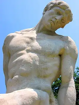 Upon his return to Bucharest, Cătărău underwent a change of lifestyle—elegant clothes, heavy gambling, fancy escorts—all of which fueled speculations about Russian payments.[9] He began associating with Timofei Kiriloff, who was either a Russian[2][15] or Bulgarian[3][6] expatriate. One reconstructed biographical sketch of Kiriloff presents him as an escapee from the Potemkin mutiny, who supported himself in Bucharest by posing for painters and sculptors. His athletic body is supposedly the model for Frederic Storck's statue of a giant, now in Carol Park;[9] though some records suggest that Cătărău himself was the inspiration for that sculpture,[6] and possibly for most statues scattered in that park.[16] The two men probably met each other while Kiriloff was trying to set up a business in haulage.[2] Cătărău also kept company with Kiriloff's lover, Vasilichia Coprian, and with another member of the circle, tailor Vasia Dimitriev. He won the latter's loyalty and affection by chasing a group of tax collectors from his house.[17]