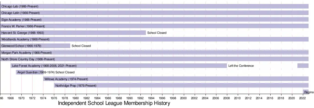 The ISL was founded in 1967.[10] The league initially comprised eight teams: Chicago Lab, Elgin Academy, Latin, Morgan Park Academy, North Shore, Francis W. Parker, and the no longer existent Glenwood School in Glenwood, Illinois (which closed its high school in 1979) and Harvard-St. George High School in the Hyde Park neighborhood of Chicago. Lake Forest Academy left the ISL in 2008 and rejoined in 2021.[11] Regina Dominican High School joined in 2022.[12]