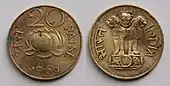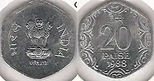 The Indian 20 coin is a former denomination of the Indian rupee. The 20 Paise coin equals 15 of a rupee.[1]
