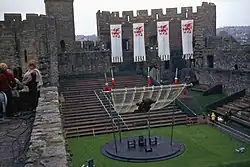 For an hour prior to the arrival of the royal family, a procession of dignitaries and guests paraded through the town and entered the castle through the Water Gate, led by the king's heralds with a guard of honour of the Welsh Guards.[11] Several dozen teenagers followed, representatives of Welsh youth. Then came the invited members of the House of Lords, the members and aldermen of Caernarvon Borough Council, members of the Gorsedd and the National Eisteddfod Court, chairmen of the 13 Welsh county councils, county sheriffs and the Welsh MPs. Church representatives arrived, then the prime minister, Harold Wilson, and his wife, Mary; the home secretary, James Callaghan; and the chiefs of staff of the armed forces.[11]