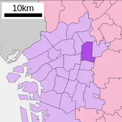 Jōtō-ku (城東区, Jōtō-ku) is one of the 24 wards of Osaka, Japan. "Jōtō" means "east of the castle", referring to Osaka Castle. It was separated from Higashinari and Asahi in 1943, and eastern Jōtō became Tsurumi in 1974. Jōtō-ku has the highest population density of any ward in a city-designated municipality in Japan, and is the only ward with a density that exceeds 20,000 people per square kilometre. When the special wards of Tokyo are also included, it is the sixth densest ward in the country after Toshima, Nakano, Arakawa, Bunkyō and Taitō. In recent years, there has been increased construction of high-rise condominiums in the western and northern parts of the ward, and the population of Jōtō-ku continues to grow.