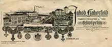The Haberfeld family settled in Oświęcim in the second half of the XVIIIth century. Jakub, son of Simon and Jacheta, founded in 1804 the Factory of Vodka and Liqueurs.[2][3] After his death, the business was inherited by his son, also Jakub (1839–1904).[2] In 1906 Emil Haberfeld became the new owner.[4] The Haberfelds were a progressive Jewish family who were involved in social life; many served on the town council and participated in charity initiatives.