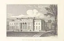 In the 1820s the Balfours employed the architect Robert Smirke, designer of the British Museum, to build a large classical mansion at Whittingehame,[1] along with a stable block and gate lodges.[15] They equipped their home with French furniture and Sèvres china.[1] Built of pale cullalo stone, the house was expanded and altered in 1827 to the designs of William Burn, which were not entirely successful. Colin McWilliam and Christopher Wilson describe them as having changed "a dry composition into a boring one".[15]
