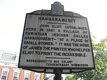 Historic marker, marking the hometown of James Printer and referencing his work with Eliot on the first Bible published in North America