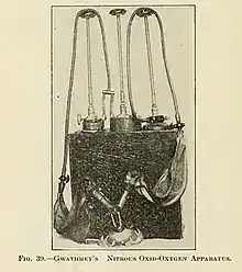 Gwathmey also developed an ether-oil anesthesia cocktail that would be given to patients rectally and was frequently used in obstetrics.[3][10] He made refinements on a 1911 nitrous oxide-oxygen Boothby-Cotton anesthesia respirator, making adjustments that allowed the operator to estimate the amount of anesthetic gases remaining as well as reducing the weight of the instrument from 50 lbs (22.7 kg) to 14.5 lbs (6.6 kg).[2] Writing with New York chemist Dr. Charles Baskerville, Gwathmey detailed his contributions and research within the first complete compilation of the medical knowledge of anesthesiology in the 1914 textbook titled Anesthesia.[2]