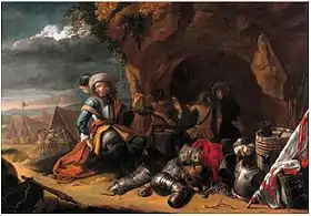 - ↑ Jan Baptist Tyssens (circa 1665-1723/4), An officer smoking a pipe by a grotto, with armour, a drum and a flag in the foreground at Christie's