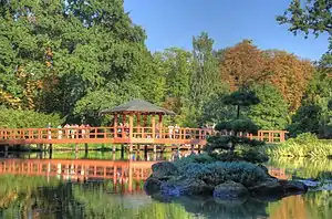 Wrocław's Japanese Garden was founded in the years 1909–1913 as an exotic garden for the Centennial Exhibition.[1] It is located in the Śródmieście district of Wrocław, in the boundaries of Szczytnicki Park, near the Centennial Hall. It is home to almost 270 taxa of woody plants, as well as 78 species of Asian plants, of which 38 are endemic to Japan, such as Styrax japonicus. It is an important landmark of Wrocław.[2]