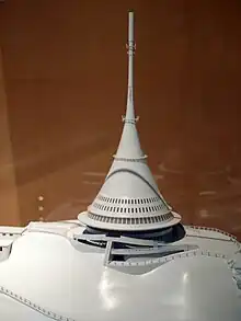 After the existing Ještěd lodge burned down in January 1963, a decision was made by Restaurace Liberec (the company that used to manage the burned-down lodges) and the Prague Radio Communications Administration to build a new complex on the summit of Mount Ještěd, which would accommodate a mountain hotel including a restaurant and at the same time would serve as a TV signal transmitter. An architectural competition for the building design was announced. It took place in February 1963 on the Liberec Stavoprojekt premises.[5] Eleven architects/teams took part in the competition, including individual architects Otakar Binar, Jiří Svoboda, Pavel Švancer, Ota Nykodým, Karel Hubáček, Jaromír Syrovátko, Miroslav Ulmann, Jaromír Vacek and teams Josef Patrný - Jiří Hubka - V. Netolička, Miloš Technik and Svatopluk Technik.[6] Hubáček's design was the only one complying with both the requirements.[6] All the designs were put on public display in the Liberec branch of Československá spořitelna. The jury (aka the council of Liberec district national committee) on its 22 April 1963 meeting chose Hubáček's proposal as the winner.[6]