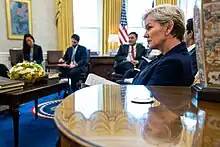 Then-President-elect Joe Biden nominated Granholm to be the next secretary of energy. Granholm was seen as one of Biden’s least controversial nominees, winning support from unions, environmental groups, and some Republicans.[121] University of California, Berkeley professor of energy Daniel Kammen, who worked with Granholm at UC Berkeley, said she will be "phenomenal for DOE" because "she understands the technology, she understands deployment and she knows how to run a big agency."[122] She appeared before the Senate Energy and Natural Resources Committee on January 27, 2021, and the committee voted to advance her nomination in a 13–4 vote on February 3, 2021.[123] She was confirmed by the Senate 64–35 on February 25, 2021, and was sworn into office later that day by Vice President Kamala Harris.[124][125] She is the first secretary of energy born outside the United States.