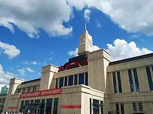 The construction of Jiamusi station started in 1935, right after the Manchukuo administration drafted the plan for the city. Two years later, Jiamusi railway station was opened to public on July 1, 1937.[3] It's claimed by historians that Jiamusi railway station was not intended to serve passenger traffic, as the station was heavily policed and all passengers in the station were thoroughly searched. Instead, Jiamusi railway station served as a freight hub for the Japanese to transport wood, ore and crops out of the region.[4]