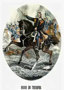 From 1868 he made several reconnaissances to help in the Siege of Humaitá, at the same time he took over the fortress's Establishment which was defended by fifteen cannons and supported by two ships with artillery, in addition to two ditches and mouths. Under heavy losses, he was wounded and had his horse killed, had his cavalry troops dismounted and attacked the fortress until he took it. Neves then participated in the Battle of Avaí. He commanded the troops that attacked Lomas Valentinas from the left, managing to take them inside the fortified position, but in the middle of the position, a bullet came to produce a serious wound in his foot.[3] Taken to Asunción, he was taken to the palace taken from Solano López. In the delirium of the fever that devoured him, under that fiery climate, legend has it that the brave general, as if in that tragic moment a Spartan soul had animated him, thought that he was still ahead of his squadrons and, throwing down the covers, waved: " Comrades!... one more charge!"[1][2] José Joaquim de Andrade Neves died in the palace on January 6, 1869.[2]